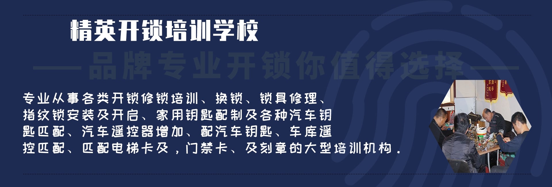 S精英開鎖培訓(xùn)學(xué)校 歡迎參觀薊縣開鎖培訓(xùn)學(xué)校網(wǎng)站!我們是正規(guī)開鎖培訓(xùn)學(xué)校,是經(jīng)工商注冊備案. 經(jīng)勞動部門批準(zhǔn)面向全國招生,提供開鎖技術(shù)培訓(xùn),本技校成立以來,本著“誠信,良心,用心”的原則方針。先后培育了全國各地有突出貢獻的優(yōu)秀鎖匠,培育優(yōu)秀道德鎖匠。本校主要從事開鎖學(xué)校培訓(xùn)、開鎖技術(shù)培訓(xùn)、薊州開鎖培訓(xùn)班、汽車開鎖學(xué)校等培訓(xùn),本校才用1對1教學(xué),奉客戶為上帝的原則去教學(xué),精英開鎖技術(shù)學(xué)校設(shè)有專業(yè)的教室,完善的設(shè)備,本技校有技術(shù)老師8名,設(shè)有直營店面3家,學(xué)員畢業(yè)經(jīng)技術(shù)堅定部門合格,發(fā)職業(yè)資格證書(鎖具修理工)全國通用。